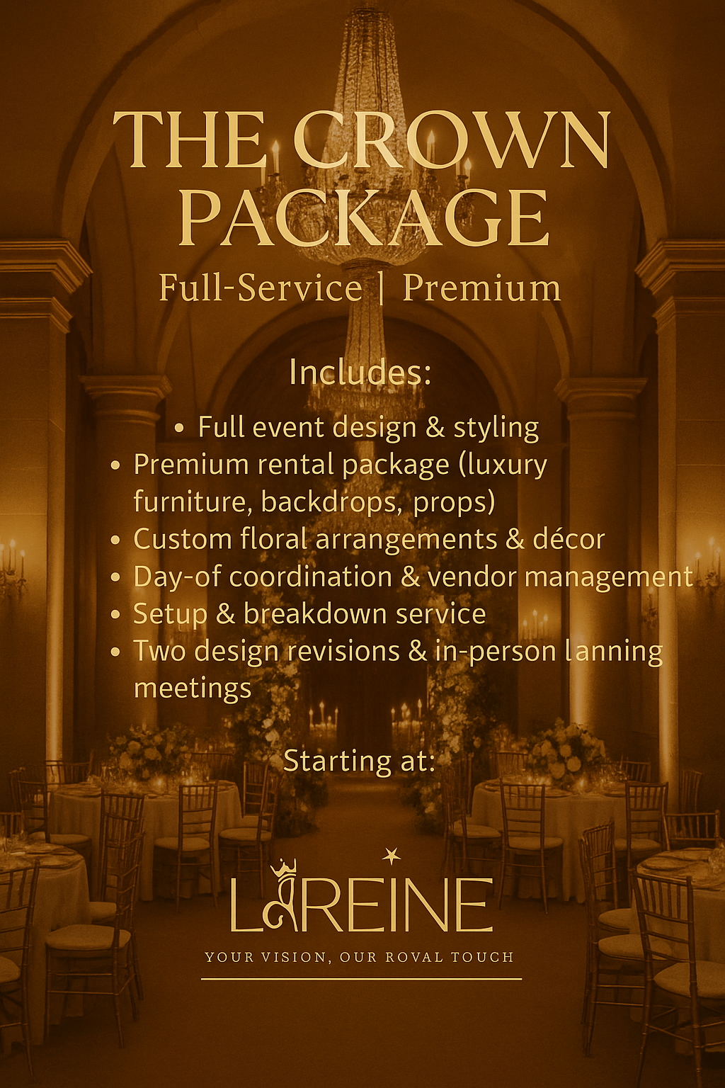 Premium rental package (luxury furniture, backdrops, props) Custom floral arrangements & décor